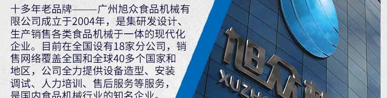 廣州旭眾食品機(jī)械有限公司是一家集科研開發(fā),生產(chǎn)設(shè)計(jì),營銷服務(wù)為一體的現(xiàn)代化生產(chǎn)企業(yè)。現(xiàn)代化生產(chǎn)車間,精湛制造技術(shù),所產(chǎn)機(jī)械歷經(jīng)市場重重考驗(yàn),不斷贏得海內(nèi)外客戶的贊譽(yù)。