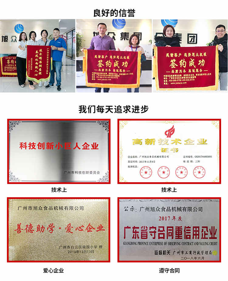 廣州旭眾食品機(jī)械有限公司是一家集科研開發(fā),生產(chǎn)設(shè)計(jì),營銷服務(wù)為一體的現(xiàn)代化生產(chǎn)企業(yè)?,F(xiàn)代化生產(chǎn)車間,精湛制造技術(shù),所產(chǎn)機(jī)械歷經(jīng)市場重重考驗(yàn),不斷贏得海內(nèi)外客戶的贊譽(yù)。