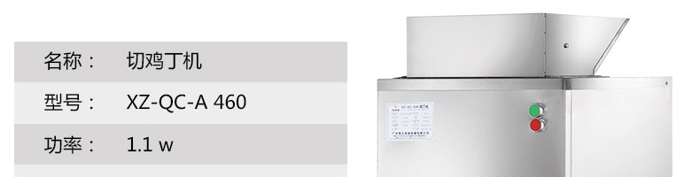 XZ-QC-A460切丁機(jī),切雞丁機(jī)適合將帶軟骨的禽類,如雞、鴨、鵝、鴿、魚類等切成塊(?。?。本系列設(shè)備工作效率高,采用不銹鋼制作,美觀耐用,切割快速,少碎骨。