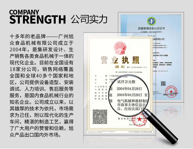 廣州旭眾食品機(jī)械有限公司是一家集科研開發(fā),生產(chǎn)設(shè)計,營銷服務(wù)為一體的現(xiàn)代化生產(chǎn)企業(yè)?,F(xiàn)代化生產(chǎn)車間,精湛制造技術(shù),所產(chǎn)機(jī)械歷經(jīng)市場重重考驗(yàn),不斷贏得海內(nèi)外客戶的贊譽(yù)。