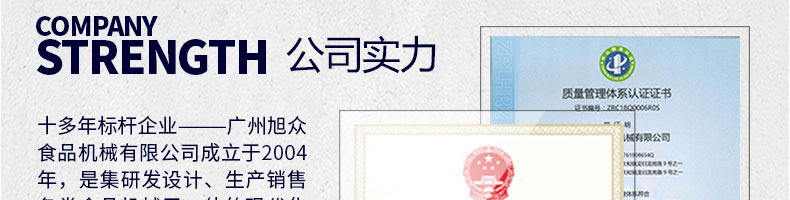 廣州旭眾食品機(jī)械有限公司是一家集科研開發(fā),生產(chǎn)設(shè)計(jì),營銷服務(wù)為一體的現(xiàn)代化生產(chǎn)企業(yè)?,F(xiàn)代化生產(chǎn)車間,精湛制造技術(shù),所產(chǎn)機(jī)械歷經(jīng)市場重重考驗(yàn),不斷贏得海內(nèi)外客戶的贊譽(yù)。