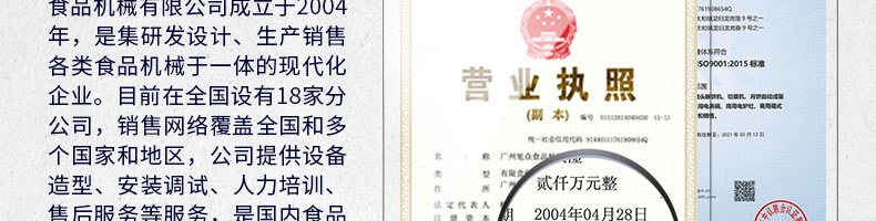 廣州旭眾食品機械有限公司是一家集科研開發(fā),生產(chǎn)設計,營銷服務為一體的現(xiàn)代化生產(chǎn)企業(yè)?,F(xiàn)代化生產(chǎn)車間,精湛制造技術,所產(chǎn)機械歷經(jīng)市場重重考驗,不斷贏得海內(nèi)外客戶的贊譽。